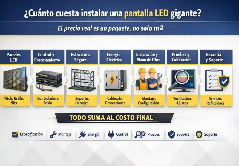 Cuánto cuesta instalar una pantalla LED gigante es una pregunta correcta, aunque, al mismo tiempo, es una pregunta “tramposa”, porque el número real sale de un paquete completo: paneles + control + estructura + energía + mano de obra + pruebas + garantía. Por eso, a continuación verás cómo se arma el precio, qué incluye una instalación profesional y, sobre todo, cómo comparar cotizaciones con criterios claros. El precio real es un paquete, no solo m² Antes de hablar de números, define el tipo de pantalla y el uso real Primero, conviene aterrizar el caso, porque no cuesta lo mismo una pantalla para escenario, un tótem exterior o una pantalla fija en fachada. Además, el uso define el brillo requerido, la distancia de visualización, el pitch y, por lo tanto, el costo por metro cuadrado. Por ejemplo, si tu proyecto es para eventos, normalmente necesitas montaje rápido, estructura modular y pruebas previas. En cambio, si tu proyecto es fijo, entonces importan más la ingeniería de anclaje, la canalización eléctrica, la ventilación y la protección contra clima. De hecho, si todavía estás decidiendo entre una solución hecha a la medida o una “de catálogo”, te conviene revisar esta guía: pantalla LED a la medida vs estándar: ¿cuál conviene?. Rangos reales: ¿qué se paga por instalar una pantalla LED gigante? Cuánto cuesta instalar una pantalla LED gigante suele moverse en rangos amplios, porque el “m²” solo es un componente. Aun así, para tener una referencia útil, puedes pensar en tres niveles: Nivel 1 (proyecto básico controlado): instalación interior, dimensiones moderadas, sin obra civil compleja, con acceso eléctrico existente y soporte estándar. Nivel 2 (proyecto profesional típico): incluye estructura adecuada, cableado ordenado, configuración de control, pruebas, capacitación y garantía sólida. Nivel 3 (proyecto crítico / exterior / alto brillo / operación continua): requiere ingeniería, protección ambiental, redundancias, monitoreo, refacciones, y soporte con tiempos de respuesta. Ahora bien, lo importante no es memorizar un número, sino entender por qué cambia. Por eso, en lugar de prometer “el precio exacto”, lo que sigue es el desglose que realmente explica el costo. Qué incluye el precio de una instalación profesional Para que una cotización sea comparable, debes exigir que incluya —por escrito— lo siguiente: 1) Paneles LED y especificación verificable Aquí se concentra una parte grande del costo, aunque no toda. Aun así, para evaluar correctamente, pide que la ficha técnica indique, como mínimo: pitch, brillo…